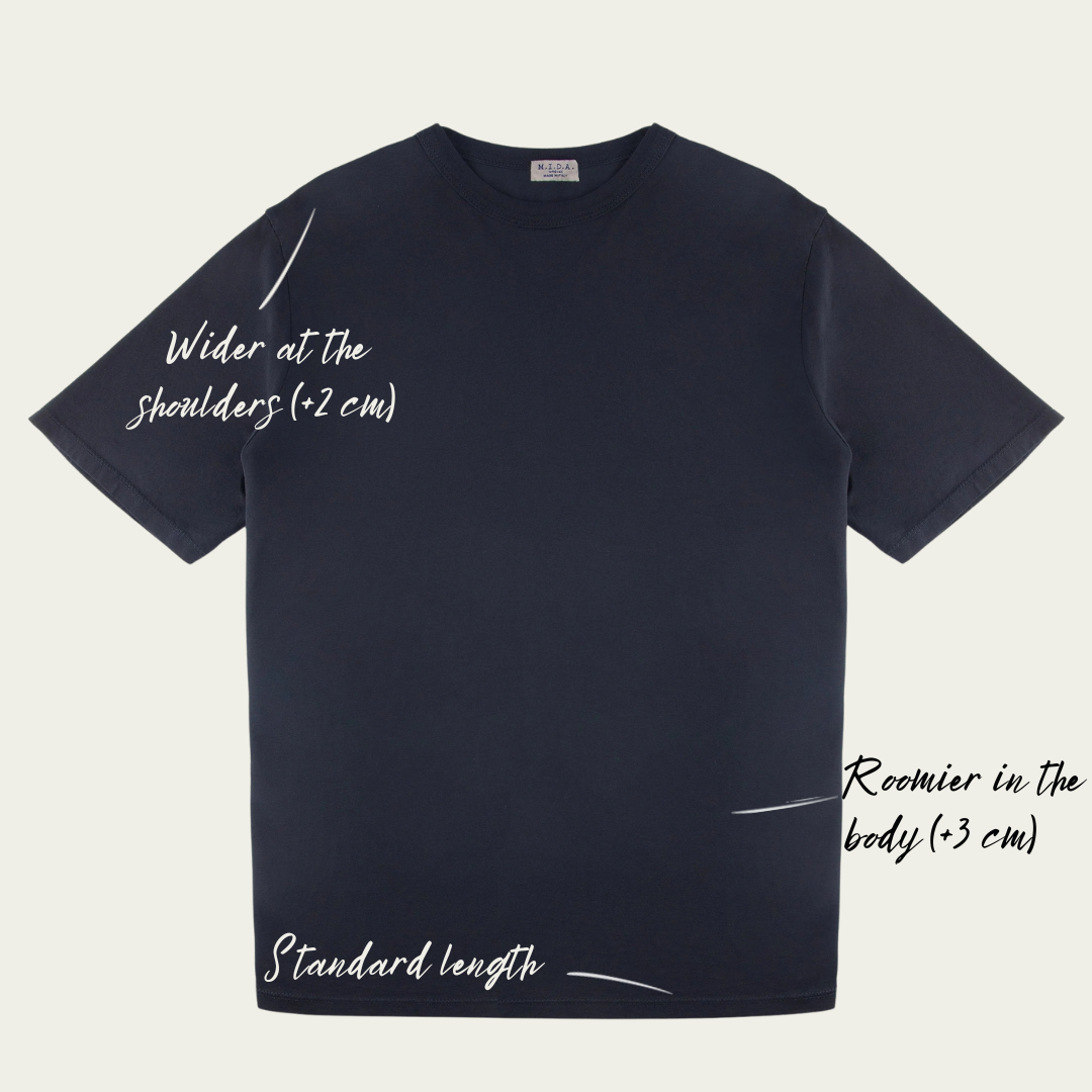 Relaxed fit: This t-shirt is slightly wider at the shoulders and body than our standard sizing. The length remains similar, resulting in a more relaxed, comfortable silhouette without looking oversized.